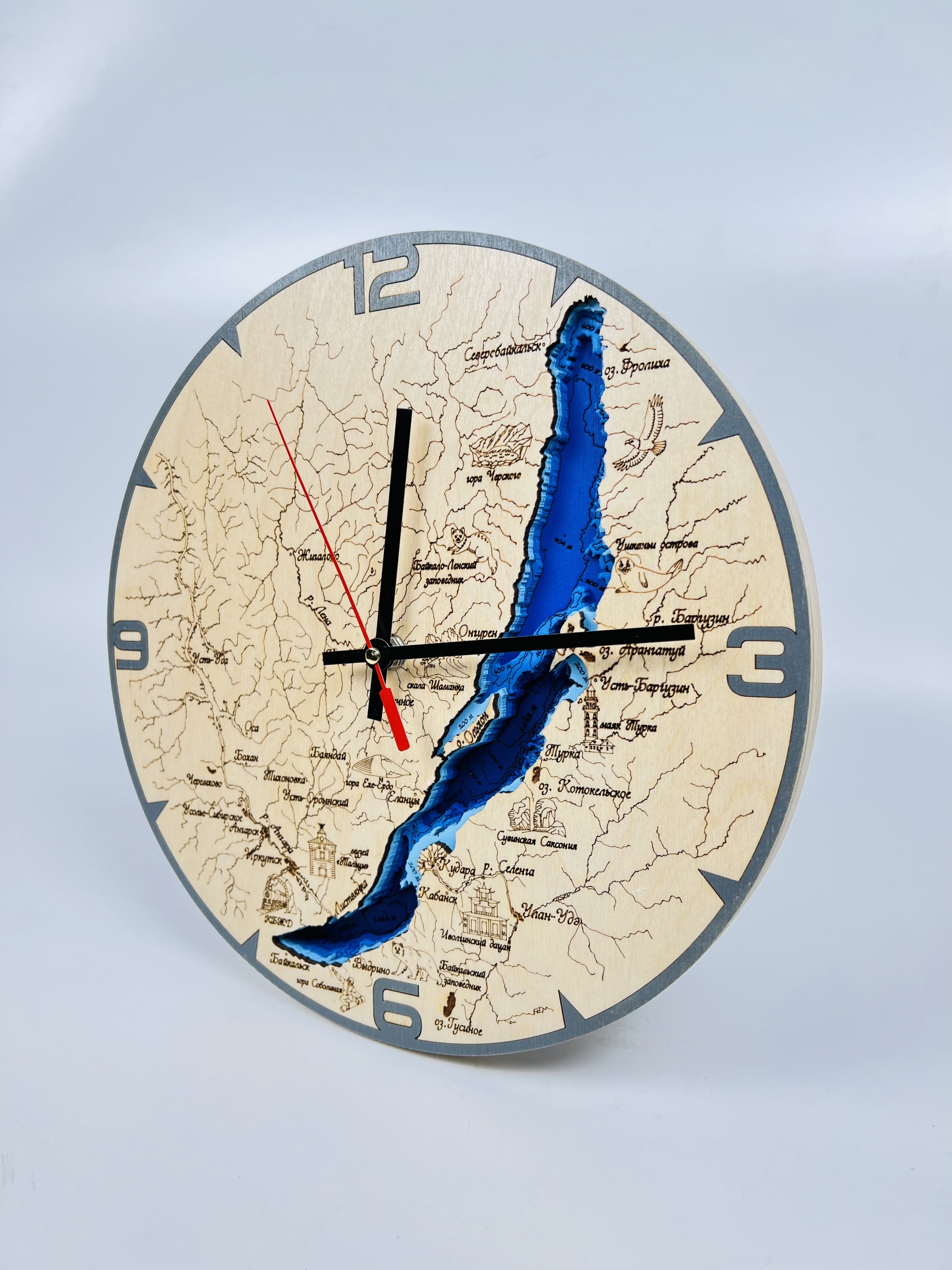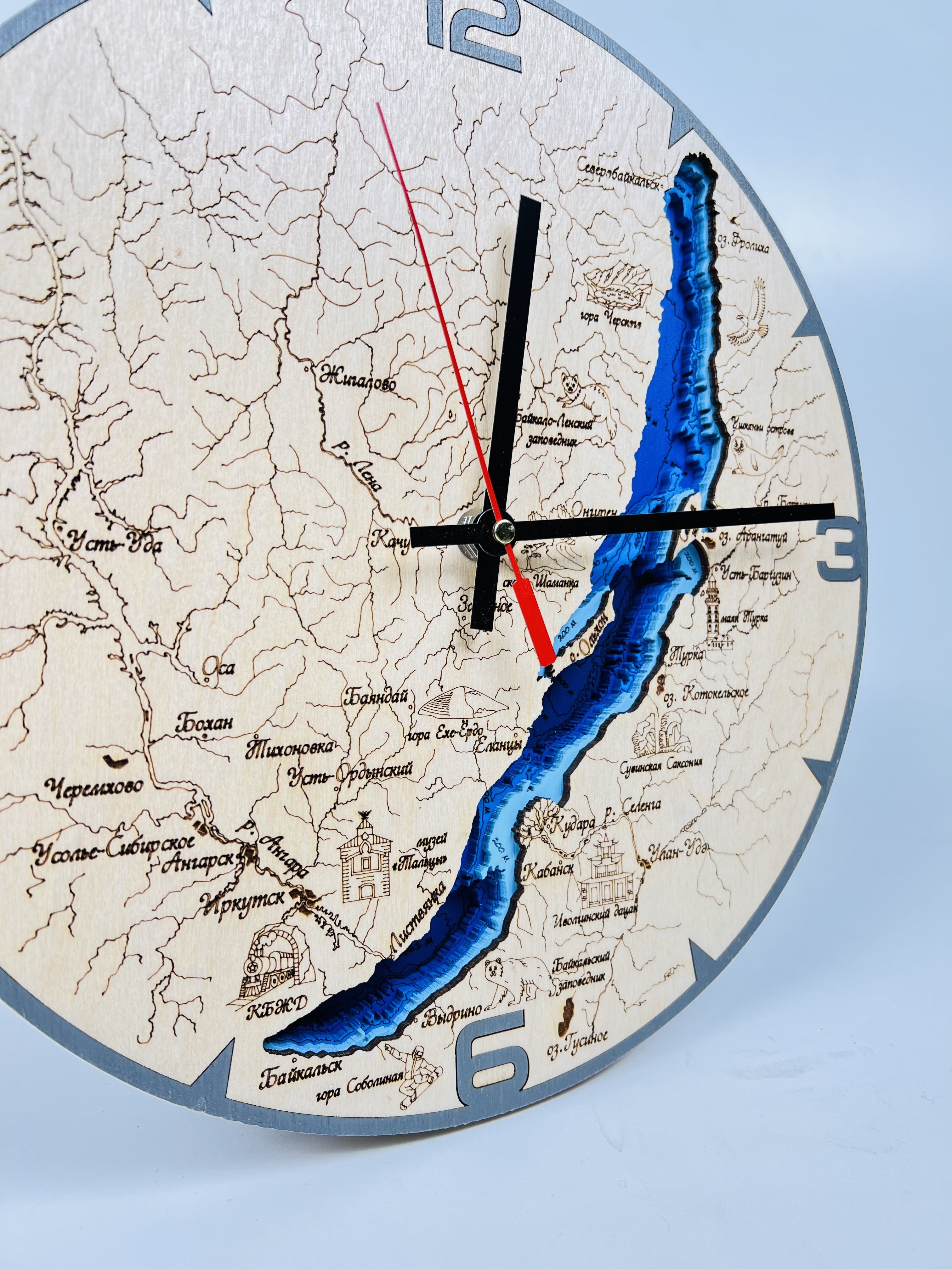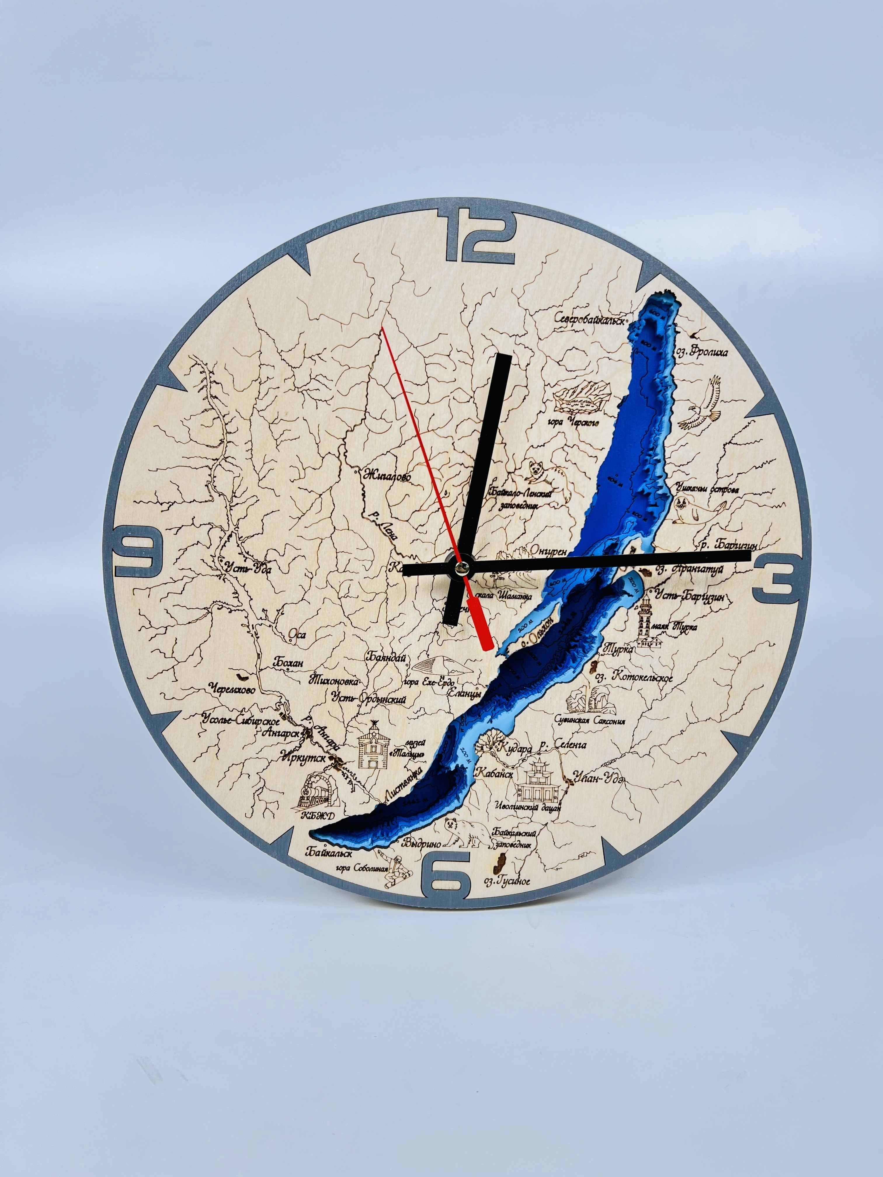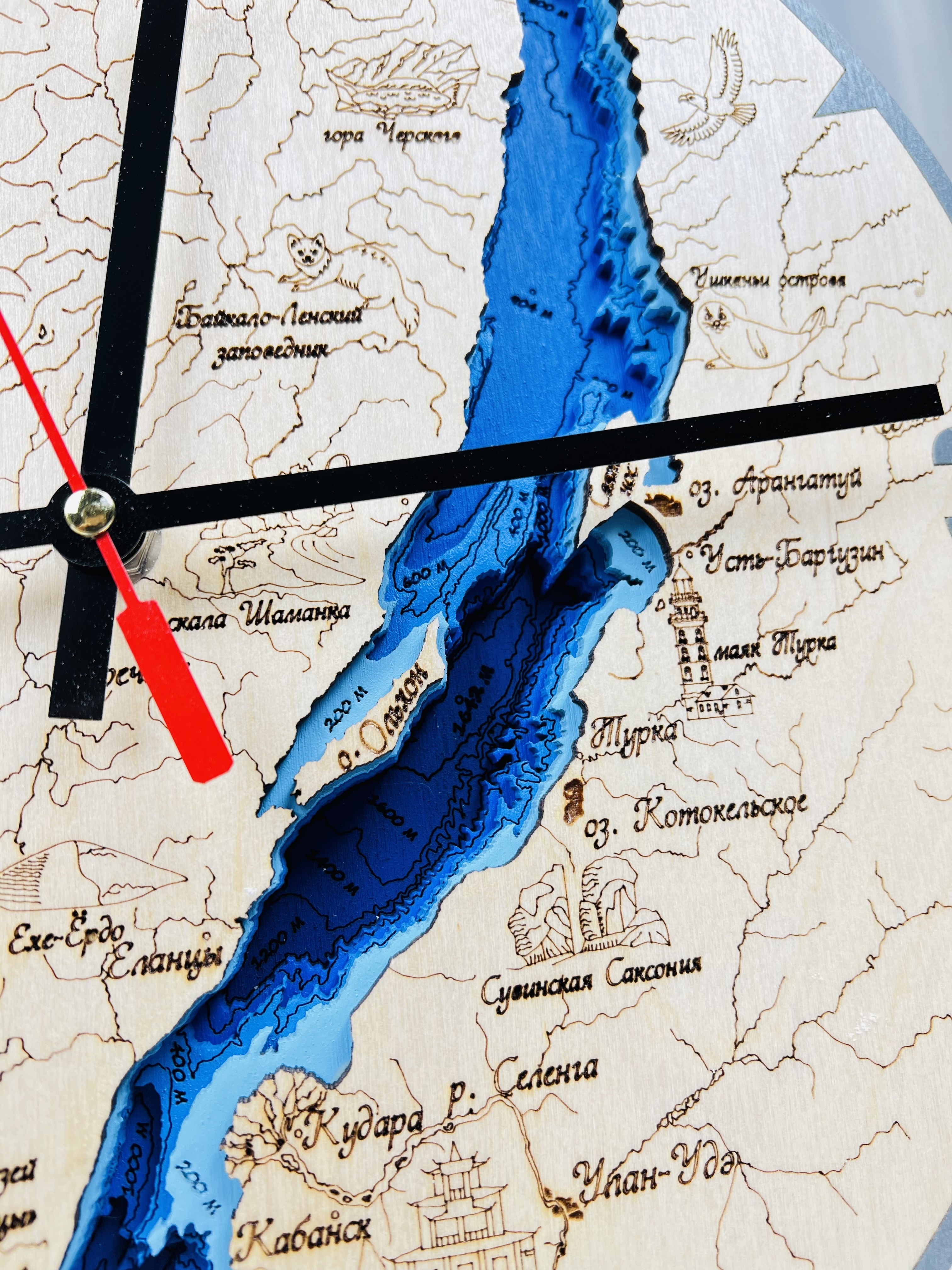 Объемные настенные часы «Байкал». Изготовлены из 5-ти слоев березовой фанеры, которые с оригинальной точностью повторяют рельеф дна акватории. На верхнем слое часов размечены основные географические объекты; нижние слои окрашены в индивидуальные цвета, благодаря чему изделие смотрится очень эффектно и необычно. Часовой механизм имеет бесшумный плавный ход. Стрелки защищены специальным футляром, предотвращающим повреждения при перевозке.