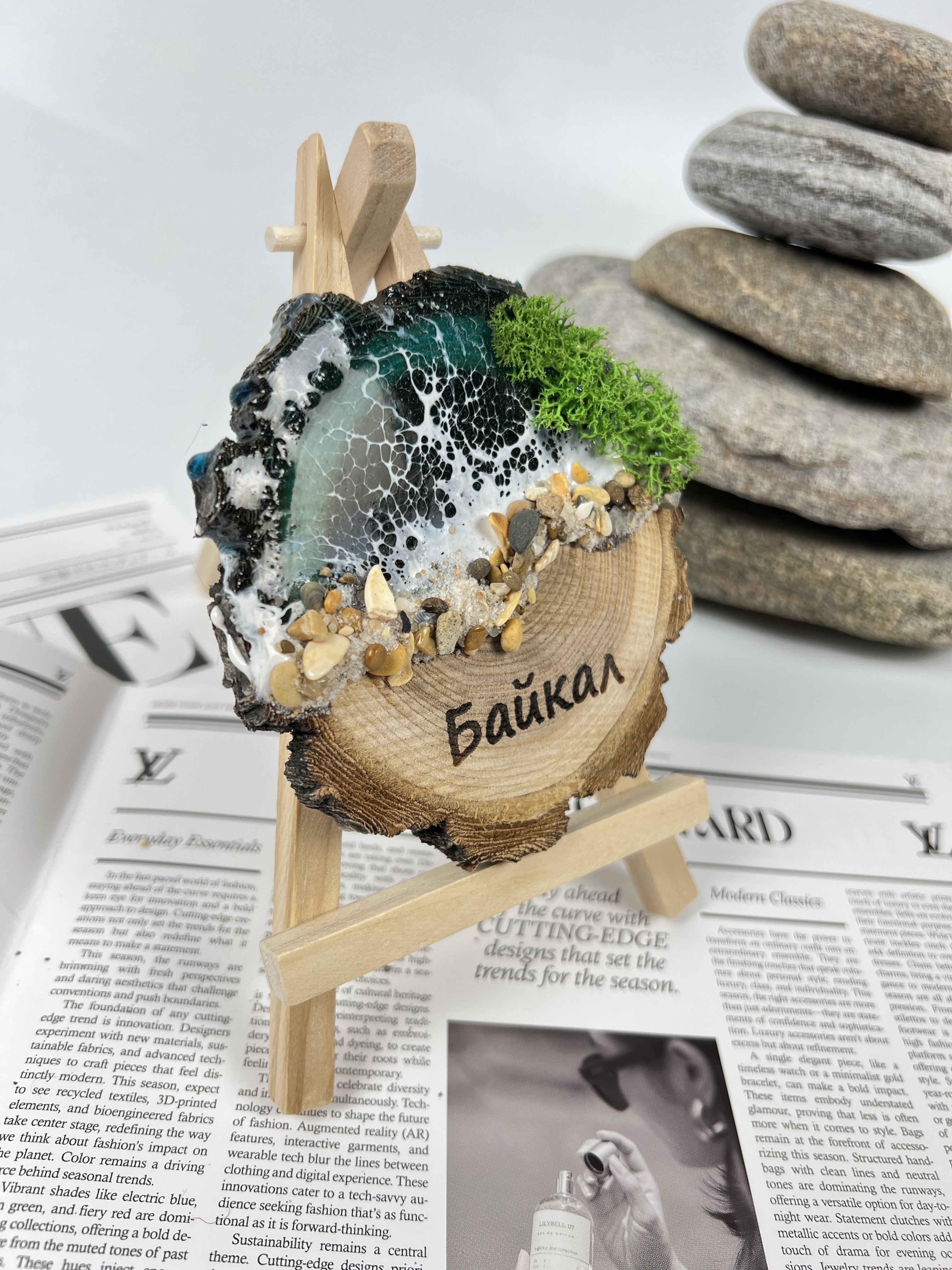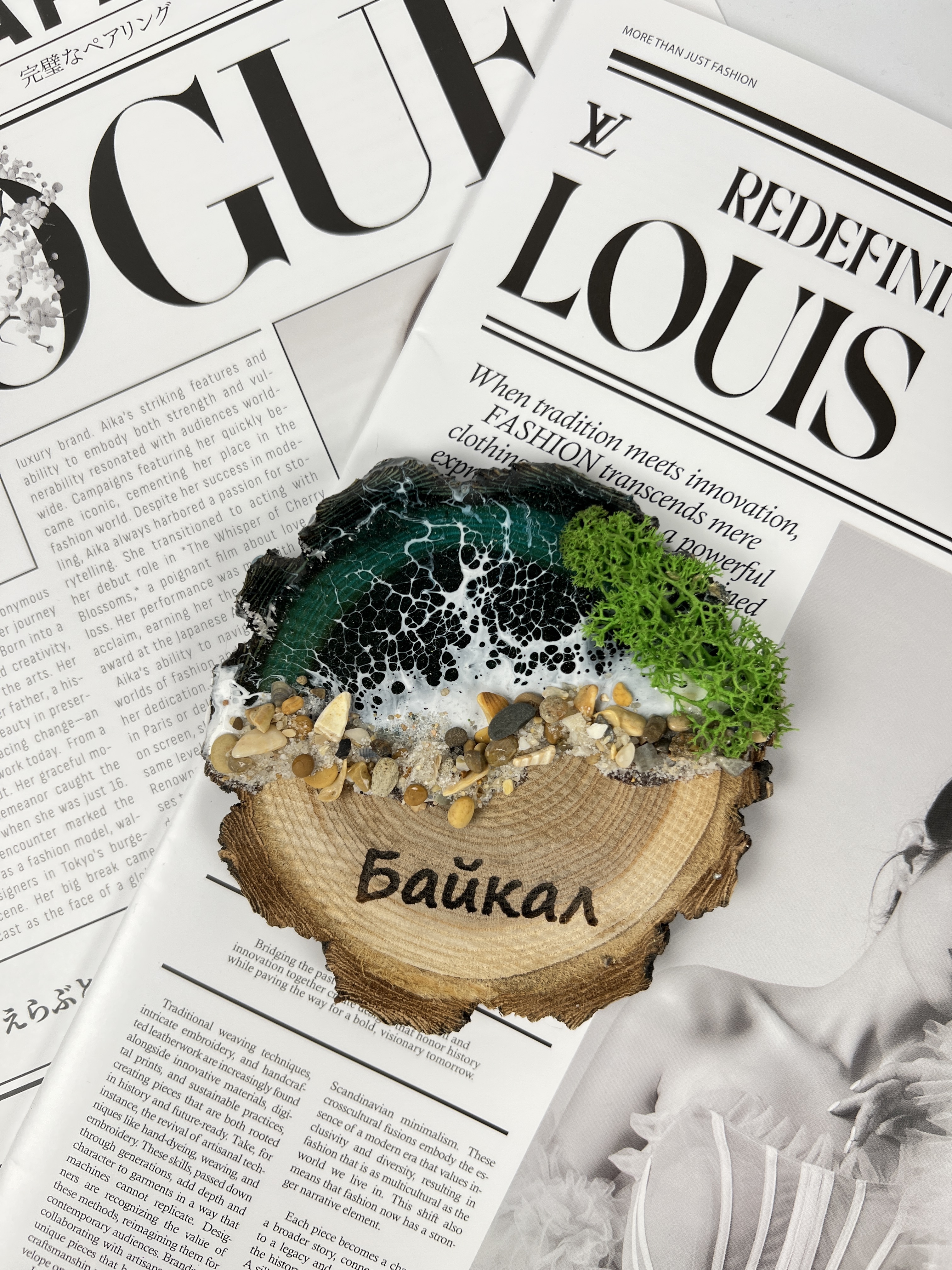Магнит «Байкальские мотивы» — эксклюзивный сувенир ручной работы размером около 10×10 см, созданный из натурального спила дерева и эпоксидной смолы. Изделие оснащено мощным магнитом, который надёжно удерживает даже тяжёлые фотографии и записки на холодильнике. Надпись Байкал выполнена на английском языке. Каждый экземпляр бережно упакован в индивидуальную подарочную коробку, обеспечивающую сохранность во время транспортировки и презентабельный внешний вид при вручении подарка.